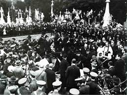 1 August 1915: The funeral of Jeremiah O’Donovon Rossa on this day. He was one the last of the old Fenians who had been exiled to America in the 19th century. He had died in New York some weeks previously and his body was returned to Dublin for burial. It was decided by the Irish Volunteers to mark his importance to the movement for Ireland’s Independence by a large turnout at his funeral in Glasnevin Cemetary Dublin.